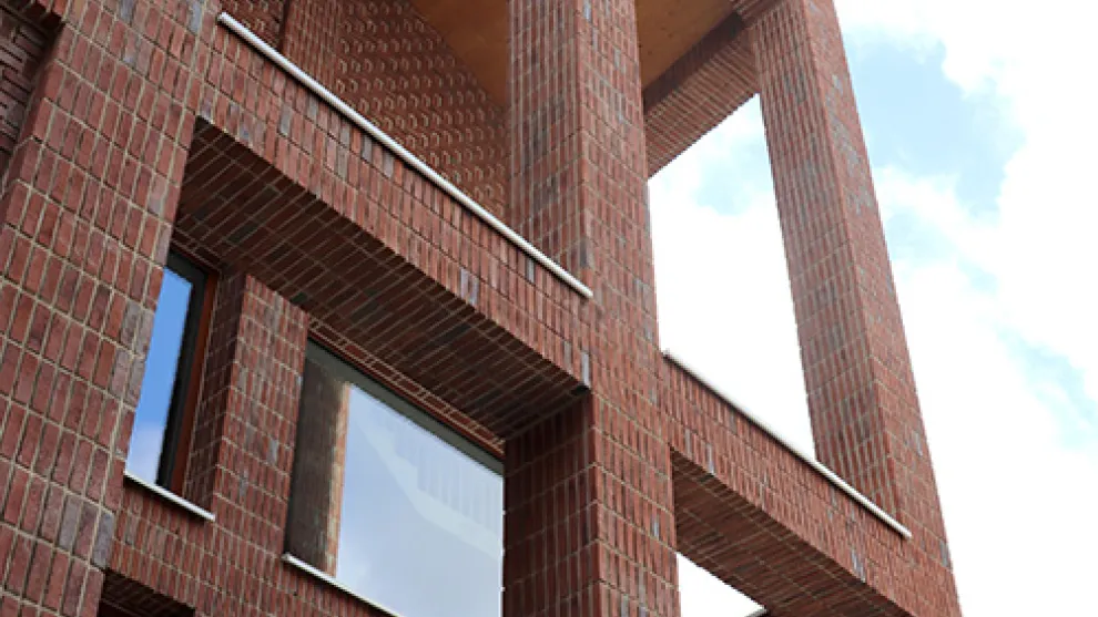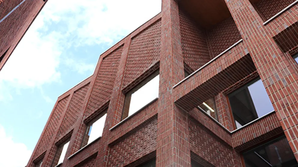 Le maçonnage spécifique de la façade, avec une brique de parement rouge-bleu plutôt classique et un jointoiement blanc, donne à l'école un aspect atypique qui s'intègre parfaitement aux bâtiments environnants.