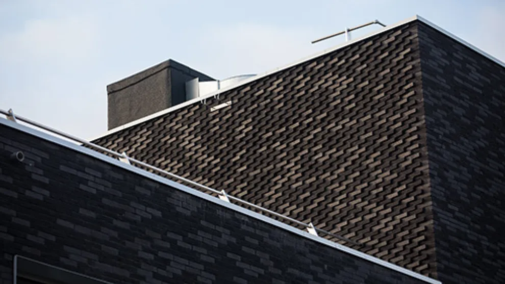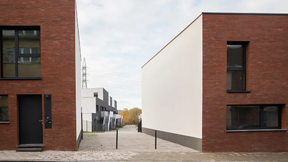 La façade des maisons, réparties sur 3 bâtiments de 3 étages maximum, est constituée d'un mélange de 2 briques du fabricant de briques Nelissen : Noir et Noir Wasserstrich de la collection Rodruza. L'entrepreneur Louis De Waele a également choisi Cantillana comme partenaire pour la fourniture d'un mortier pour joints minces "Mur 12 DBM » de couleur gris foncé (couleur 013), appliqué en joint de 6 mm, parfaitement assorti aux briques Nelissen. Urban Platform a opté pour une façade en briques atypique dans laquelle les briques sont disposées en quinconce, formant un relief visible avec l’angle des briques.