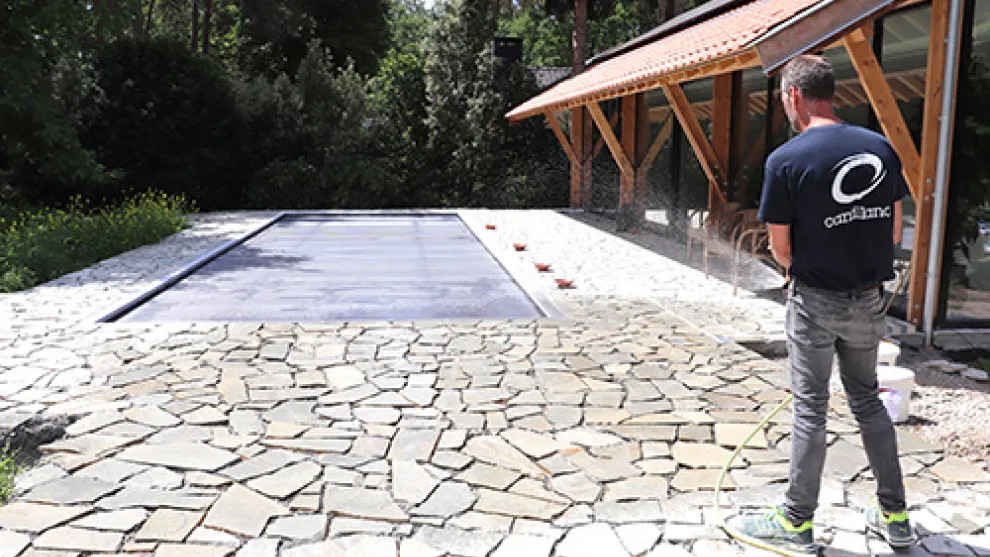Tout autour du bassin, l’entrepreneur Eric De Hoef a réalisé un aménagement drainant composé d’une couche de fondation stabilisée ; d’une membrane drainante, du mortier de chape drainant Chape Drain 15.