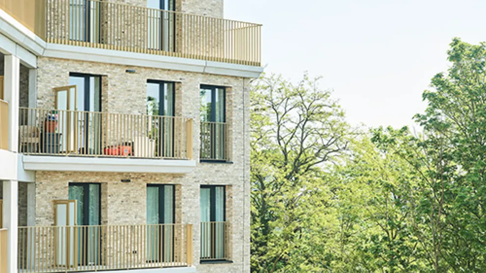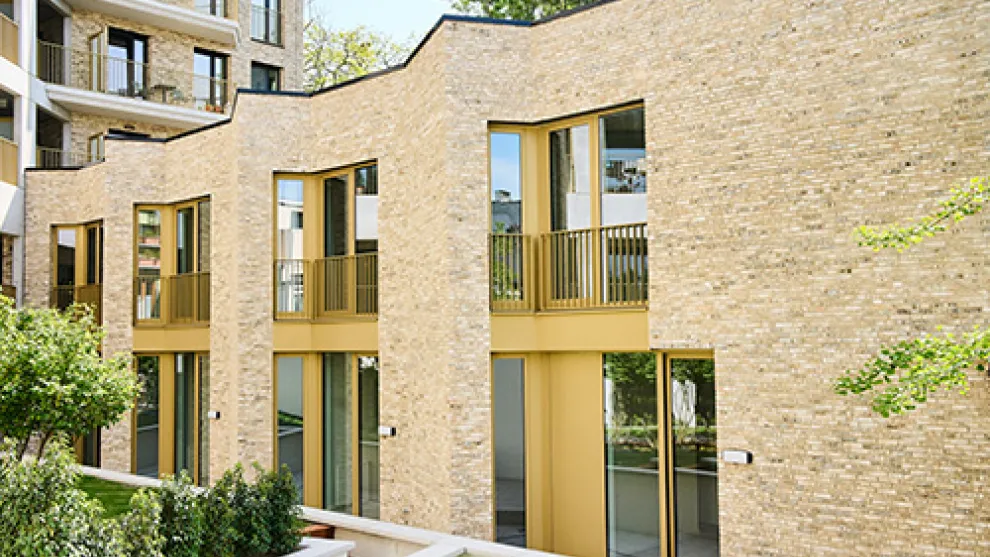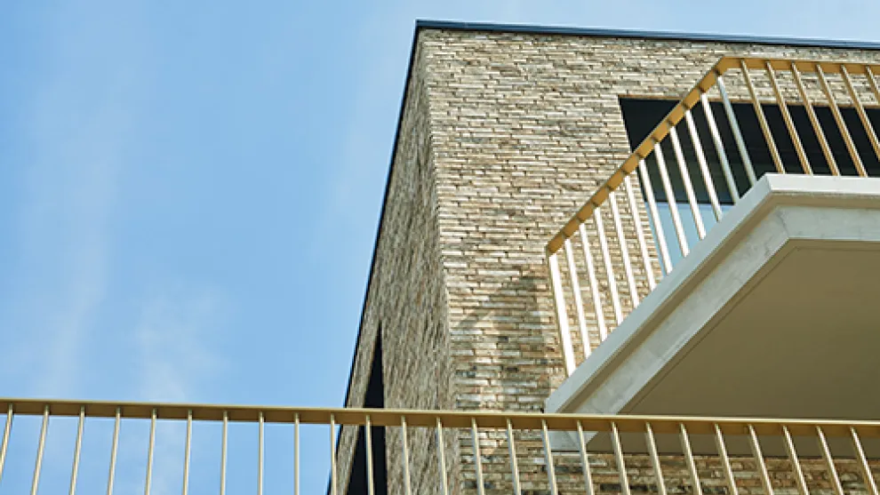 Les balustrades des balcons et les baies vitrées de couleur dorée s'intègrent parfaitement aux maçonneries.